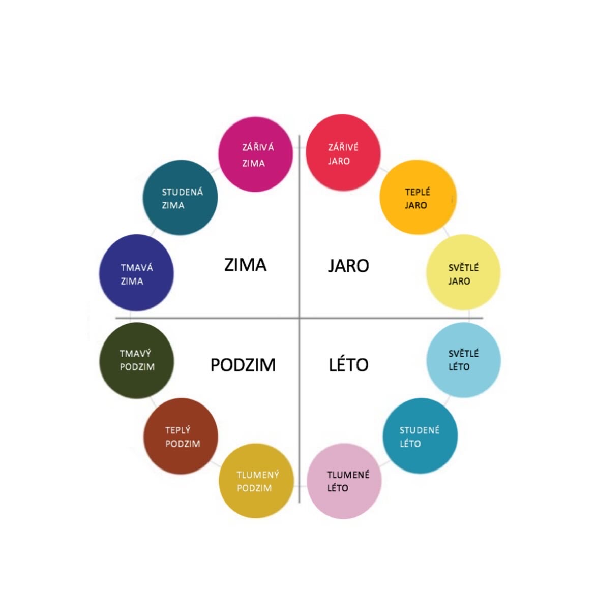Typologie barev rozděluje lidi do čtyř základních sezónních typů – jarní, letní, podzimní a zimní – podle přirozeného zabarvení pleti, vlasů a očí. Jarní typ působí svěže a teple, sluší mu jemné, teplé a jasné odstíny (meruňková, lososová, teplá béžová). Letní typ má chladnější, zjemněné tóny a vynikne v pudrových, kouřových a pastelových barvách. Podzimní typ je teplý a sytý, krásně vypadá v zemitých odstínech (hořčicová, olivová, cihlová). Zimní typ je kontrastní a výrazný, nejlépe mu sedí čisté, syté a chladné barvy (černá, smaragdová, královská modrá).